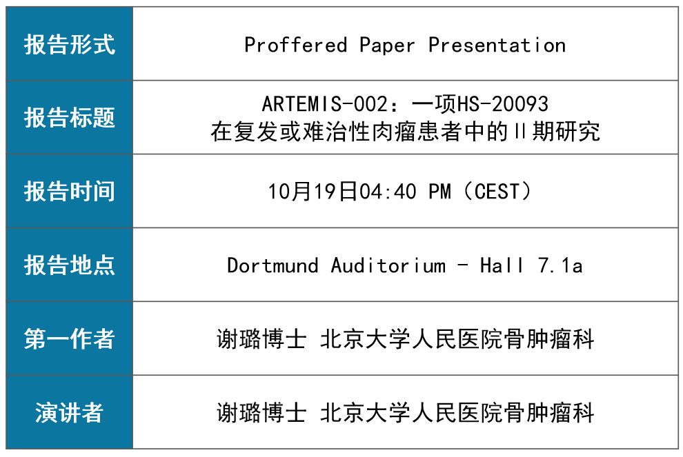 ARTEMIS-002是一项开放标签、三队列Ⅱ期临床研究,研究对象为接受标准系统性治疗后发生进展的复发或难治性骨肉瘤或其他肉瘤患者。队列1中的成年骨肉瘤患者接受HS-20093 8mg/kg或12mg/kg,每3周1次的治疗。队列2其他肉瘤成年患者和队列3骨肉瘤青少年(12~17岁)患者接受HS-20093 12mg/kg,每3周1次治疗,直至疾病进展。主要终点是队列1和队列2中研究者根据RECIST v1.1标准评估的ORR,和队列3中的安全性。