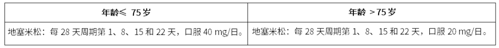 推荐剂量 本品的推荐起始剂量为25mg。在每个重复28天周期里的第1~21天,每日口服本品25 mg,直至疾病进展。地塞米松的推荐剂量为在每28天治疗周期的第1、8、15和22天口服40 mg地塞米松。处方医生应根据患者的年龄选择地塞米松的起始剂量和随后的剂量调整(见表1)。