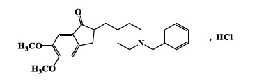| 【成份】 | 本品主要成份为盐酸多奈哌齐。 化学名称:(±)-2-[(1-苄基-4-哌啶基)甲基]-5,6-二甲氧基-1-茚酮盐酸盐 化学结构式: